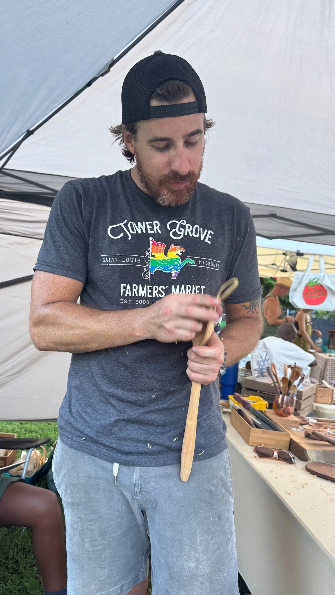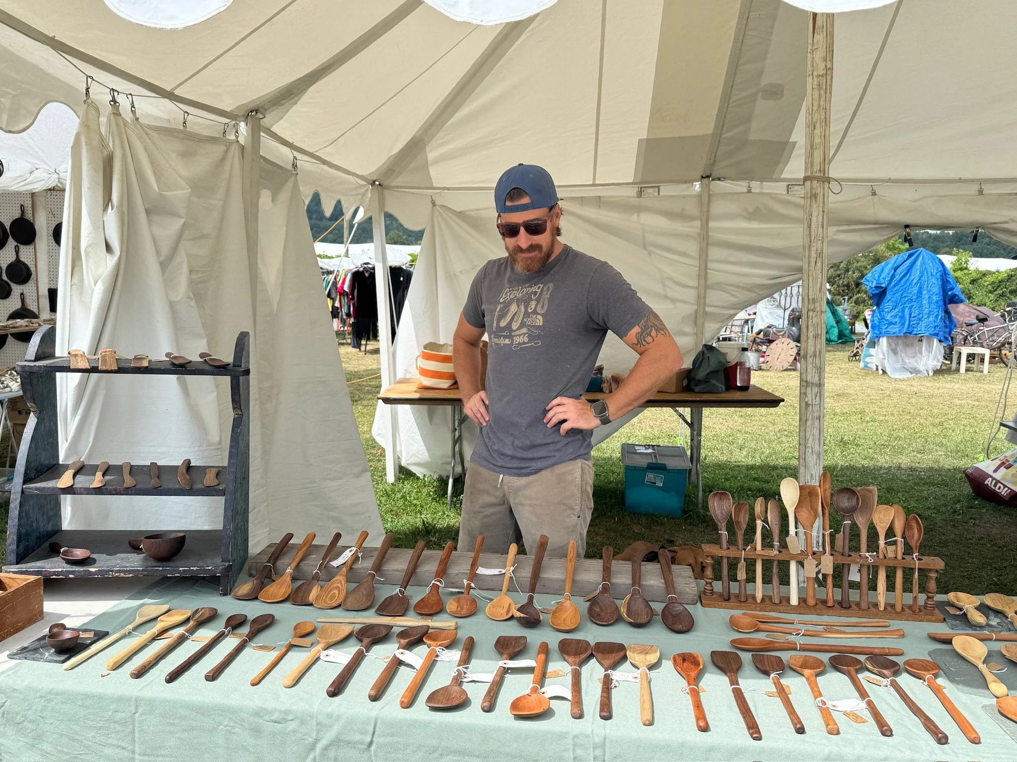 Follow the trail of wood shavings and the scent of cutting board oil to the OC SPOON CO tent where you will see this guy showing off his skills.